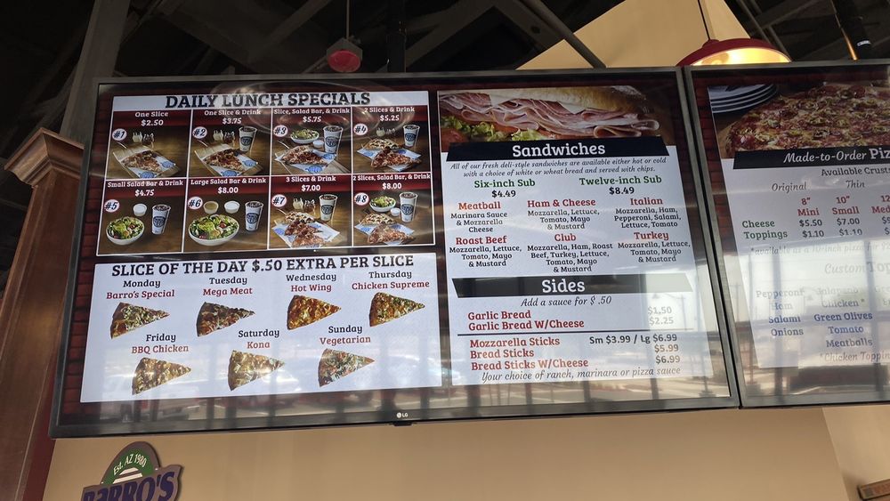 Complement your meal with the popular Cinnamon Sticks, coated in cinnamon and served with a sweet icing dip, or the renowned honey hot wings, which are generously slathered in sauce. The spacious, clean environment, along with fast service, guarantees a pleasant dining experience. Whether you're grabbing a quick pickup or enjoying a meal onsite, Barro's Pizza Buckeye promises delicious food that's sure to satisfy your cravings!